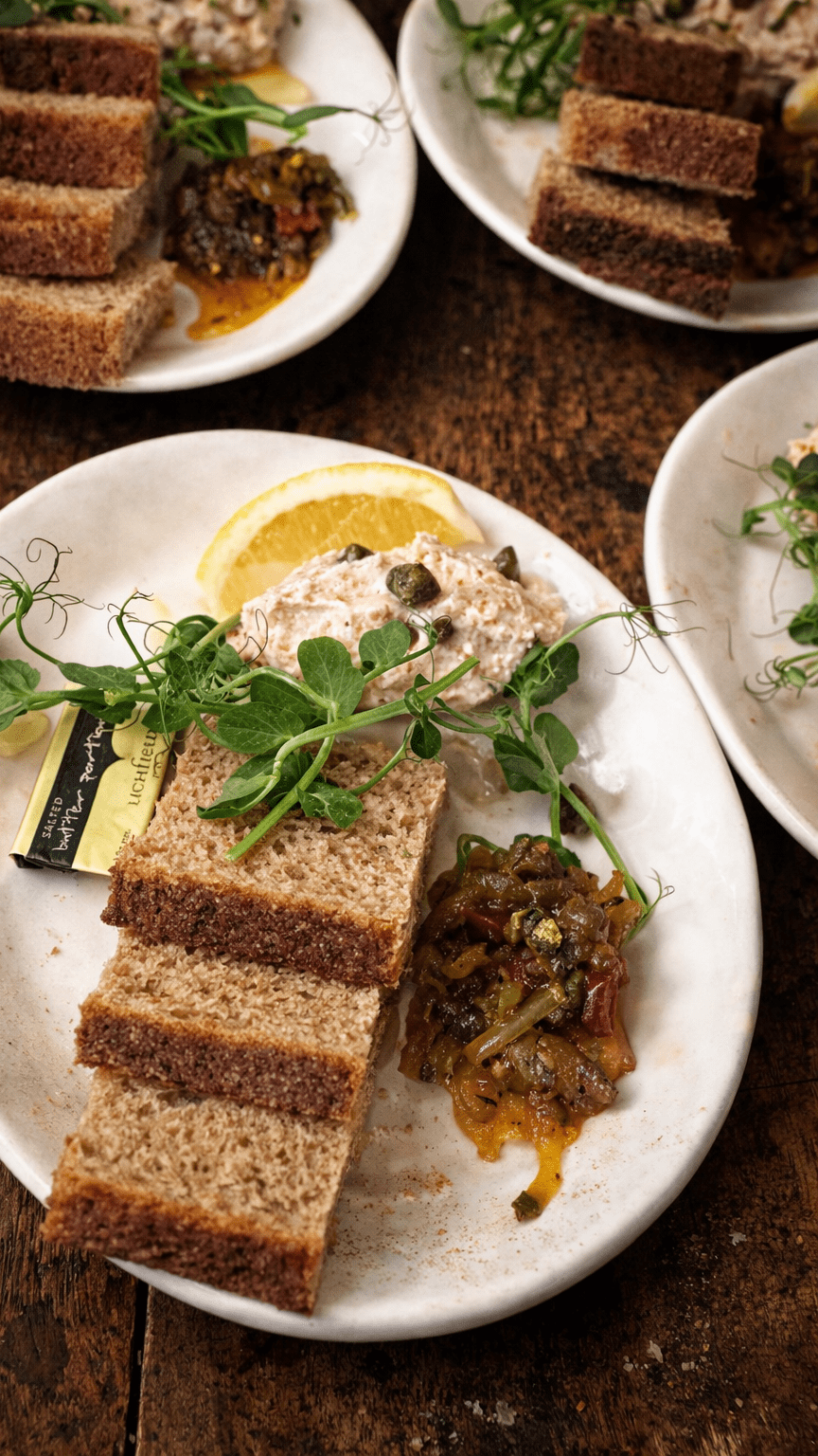 Chicken liver and brandy parfait with pickled shallots, cornichons, stout n onions marmalade and brioche toast.